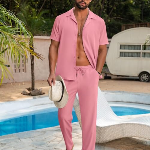 • Design: enduring fashion 2 piece mens outfits,short sleeve,button down closure, lapel collar,Loose long pants with stretchy waist