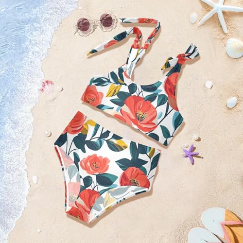KLL Floral Pattern Red Roses Girl Two Piece Bikini Set Scoop Neck Swimsuits Swimwear Adjustable Shoulder Strap 2