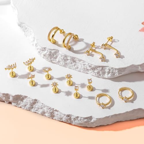 • Earring Sets for Multiple Piercing:jagosen Earring stacks includes 4 pairs flat back earrings, 1 pairs of huggie hoop earrings and 2 pair of earrings jacket. These hypoallergenic flat back earrings are dainty and look more trendy, stud and hoop earring sets for multiple piercing, such as cartilage earring, helix piercing, first hole, second hole, third hole, tragus piercing, etc.