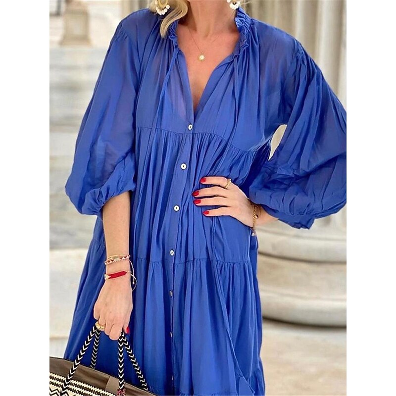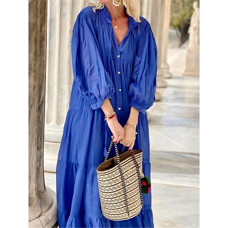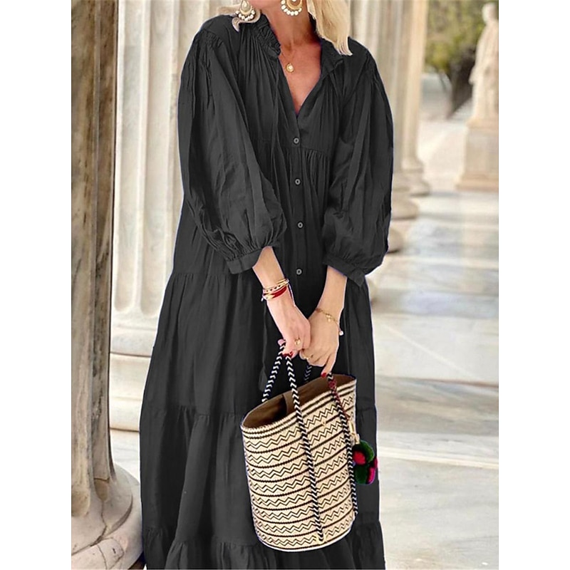 Highlights [Fabric]: Featuring a linen cotton blend, this dress offers lightweight breathability, ideal for spring and summer wear. The fabric drapes beautifully and ensures comfort throughout daily activities or weekend outings. [Fit]: The dress has a loose fit, allowing for ease of movement and comfort. Its tiered skirt creates a voluminous, dynamic silhouette, while the 3/4 length sleeves add to its relaxed vibe. [Design Highlights]: The shirt dress design includes a classic shirt collar and buttons down the front, providing a versatile and timeless style. Subtle gathers around the neckline add a refined finish, enhancing its overall elegance. [Occasions]: Perfect for daily wear or weekend gatherings, this dress easily adapts from casual daywear to more polished occasions, making it a versatile wardrobe staple. [Size]: Available in sizes S, M, L, and XL, ensuring a comfortable fit for a variety of body shapes and preferences.