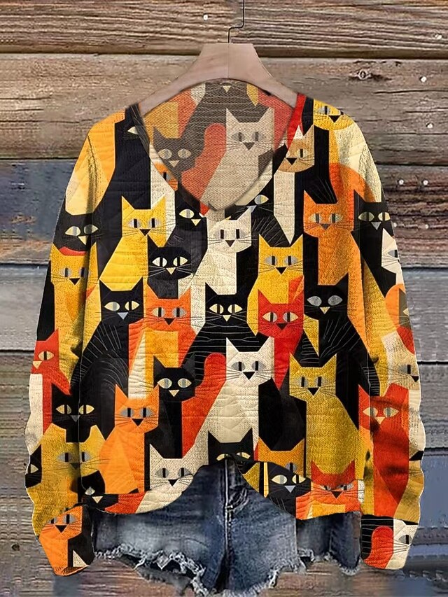 : The playful, geometric cat pattern in vibrant shades of orange, yellow, red, and black against a neutral backdrop creates a striking look. The V-neckline adds a touch of elegance, and the digital print technique ensures vibrant, long-lasting colors.