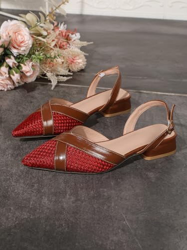HOT ! Closed Pointed Toe Adjustable Slingback Low Heels for Women, Women's 1 Inch Block Chunky Heel Sandals Pumps with 2 Cross Bands Red Textile Backless Slip On Mules Shoes