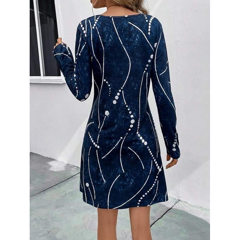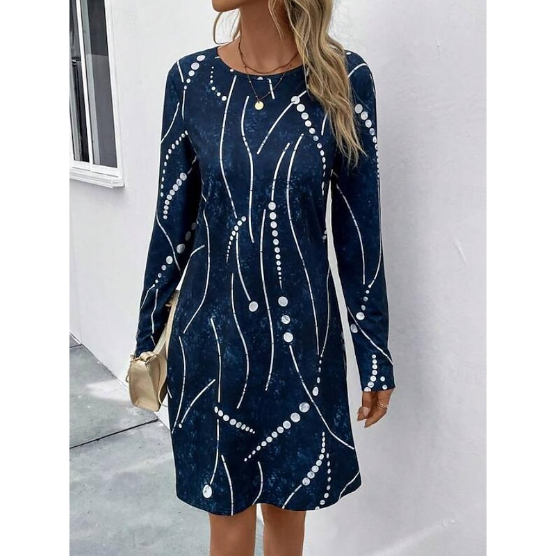 Highlights [Fabric]: Crafted from high-quality polyester, this dress offers a lightweight feel perfect for the warmer seasons of spring and summer. The fabric ensures comfort and breathability, making it ideal for daily wear. [Silhouette]: This mini dress features a classic A-line silhouette that gracefully complements various body types. The regular fit ensures a flattering shape without compromising on comfort. [Design Highlights]: Featuring an elegant dark blue color adorned with white polka dots, this dress captures a timeless yet modern aesthetic. The design includes a sophisticated crew neck and long sleeves, adding an element of modesty balanced with style. [Occasions]: Perfect for both casual and semi-formal settings, this dress is versatile enough for daily outings or gatherings. Pair it with a clutch and jewelry for an elevated look that suits a wide range of environments. [Size Range]: Available in a variety of sizes including S, M, L, XL, and 2XL, ensuring a comfortable fit for different body shapes.