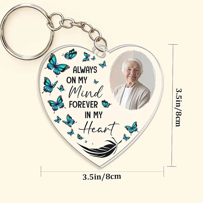 Highlights - A personalized keychain to remember your loved one - Made with high quality materials - Beautiful design, ideal for gifting to family or friends - Perfect addition to your key ring or as a keepsake on your desk or dresser - Excellent gift for someone who has lost someone special in their life - Features a heartfelt message: "Your Wings Were Ready but My Heart Was Not. Always On My Mind, Forever In My Heart." - 1-sided design - Made of transparent acrylic - Measures 8*8cm - Thickness of 6.5mm