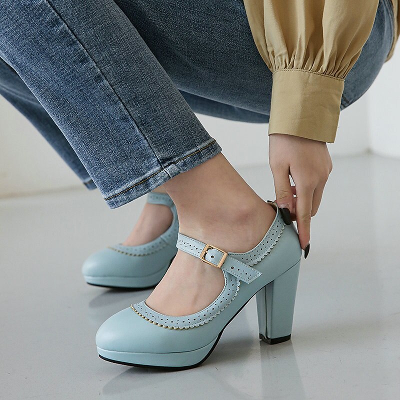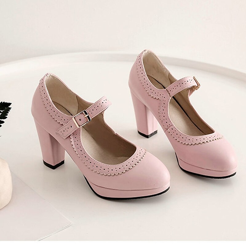 The shoes are adorned with a chic Mary Jane design, including a charming scalloped edge with intricate perforated details. An adjustable strap with a metallic buckle ensures a secure fit while enhancing the overall vintage aesthetic. Available in a range of solid colors such as white, black, and pink, these shoes are both fashion-forward and functional.