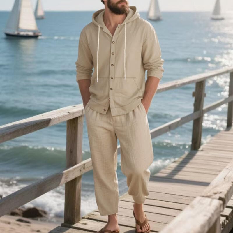 • 【Casual 2 Piece Outfits】- Men's hooded shirt with button closure, long sleeves, two pockets, simple style, solid colour, rounded hem. Loose beach trousers have elasticated waist and two slash pockets, providing enough waist and leg room for you to move freely.