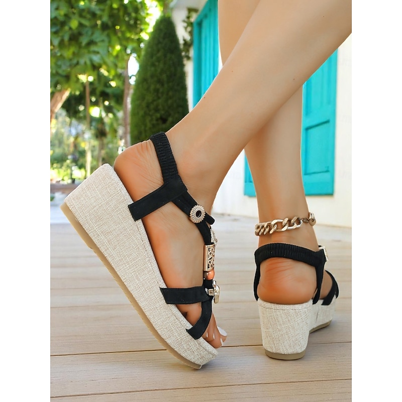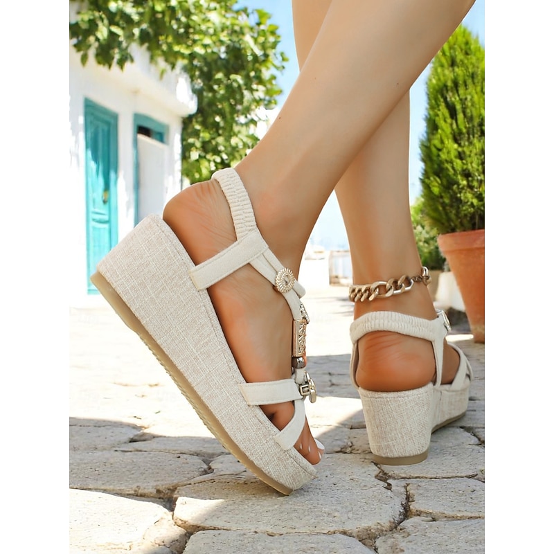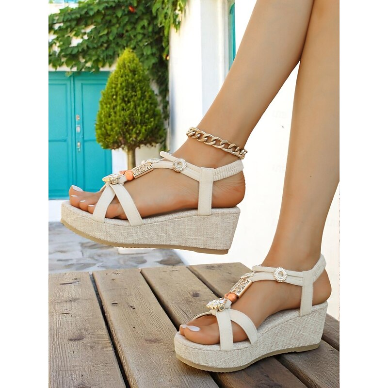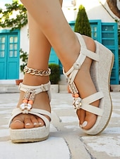 HOT ! Women's Beige Wedge Sandals with Beaded Charm Accents – Comfortable Boho Style Platform Sandals for Summer Travel, Beach Holidays, and Casual Outings