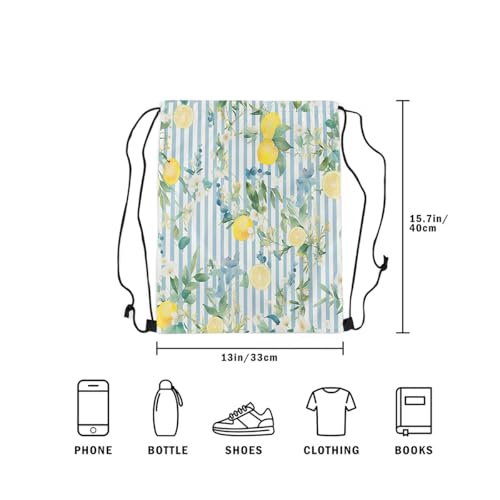 jejeloiu Lemon Drawstring Backpack 13x15.7inch Tropical Fruit Print Waterproof Gym Drawstring Bags Blue Striped Sports String Backpack Beach Swim Travel Bag Sackpack 5