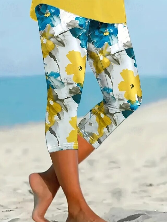 Women's Capri Pants Leggings Cozy Leggings Streetwear Casual Calf-Length Natural Floral Print Comfy Outdoor Comfortable Outdoor Vacation Casual Daily Yellow Blue Summer Regular Fit 7