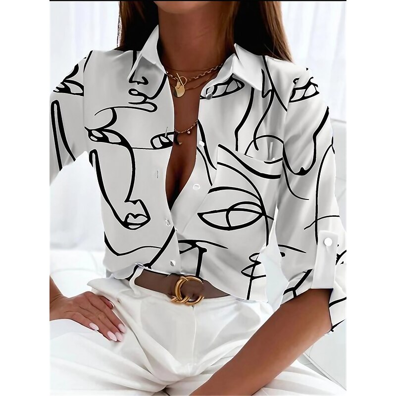 Highlights [Fabric] : Crafted from a breathable polyester fabric, this elegant blouse ensures comfort and a micro-elastic fit, perfect for all-day wear in the spring and fall seasons. [Fit] : This long-sleeve blouse is designed with a form-fitting silhouette, providing a sophisticated yet relaxed look that complements a variety of body types. [Design Highlights] : Featuring a bold abstract face print, this shirt stands out with its traditional shirt collar and button-down front. The three-quarter length sleeves with buttoned cuffs add a chic touch, giving it versatility for both dressy and casual outfits. [Occasions] : Ideal for daily wear, casual outings, and work environments, this blouse is a must-have for those seeking style and elegance in their wardrobe. Whether you're heading to the office or a weekend gathering, this piece elevates any look. [Size Range] : Available in a wide range of sizes from S to 2XL, allowing you to select your usual size for a comfortable fit. Perfect for everyday use. superior materials and excellent craftsmanship ensure long-lasting durability.