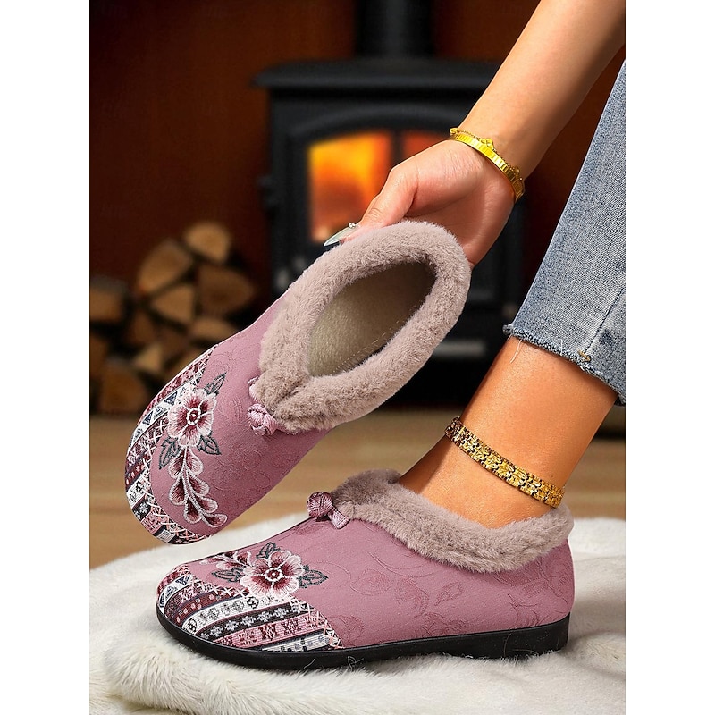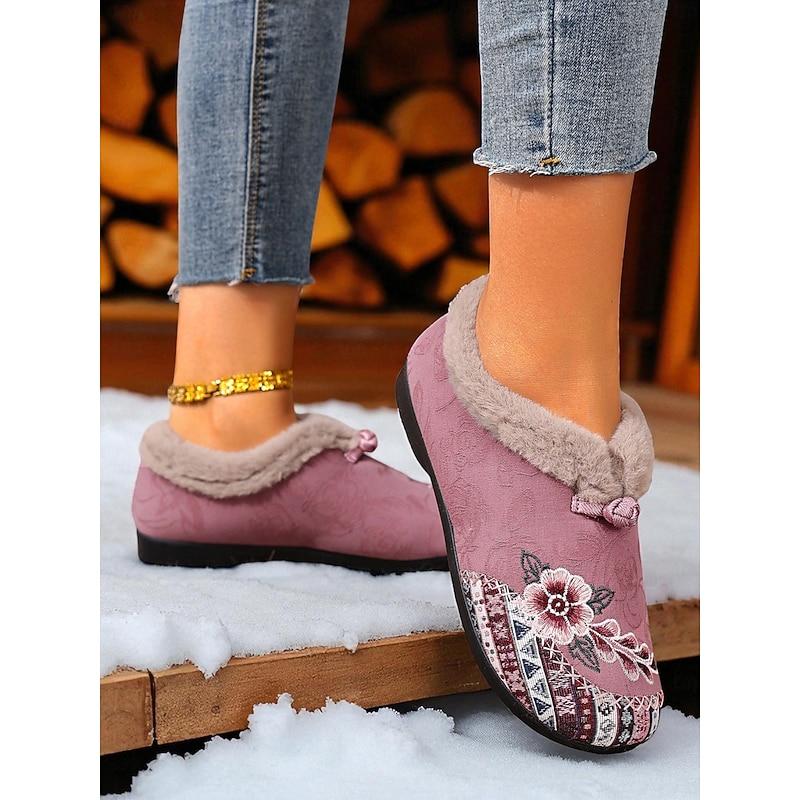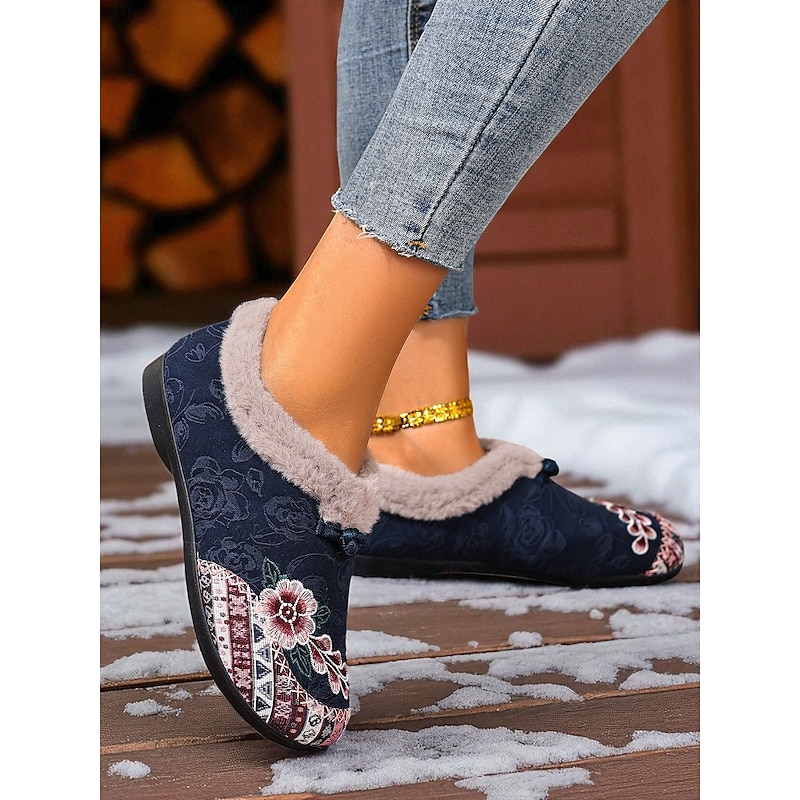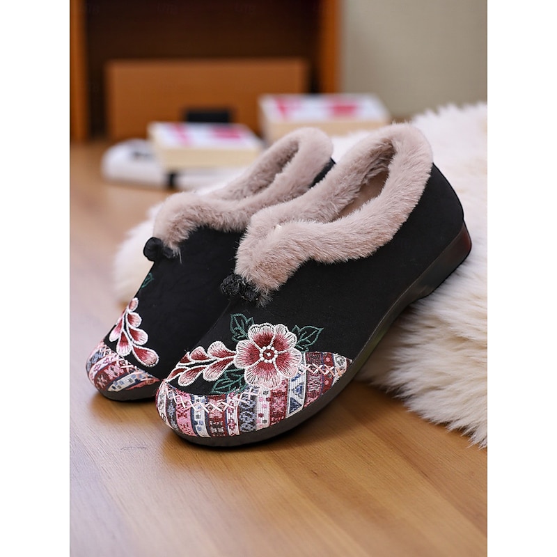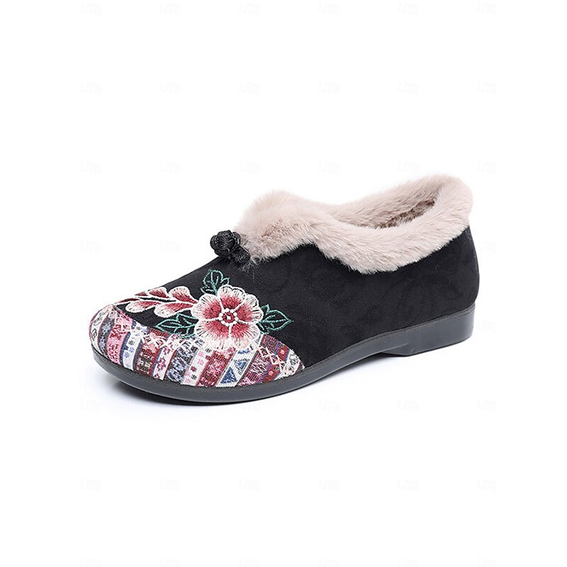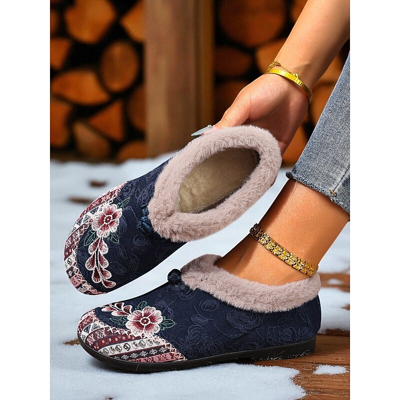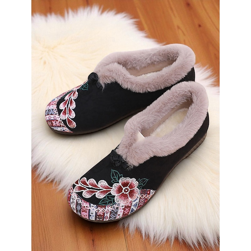 HOT ! Women's Red Embroidered Fur-Lined Slip-on Shoes with Floral Pattern, Warm Winter Shoes for Christmas, Holiday Season and Casual Wear