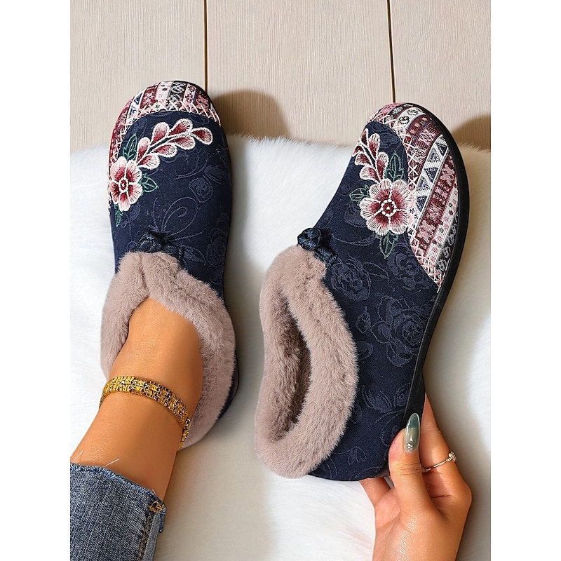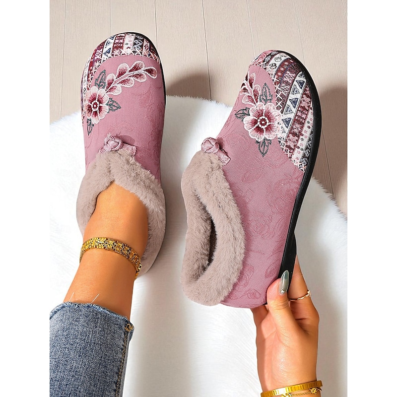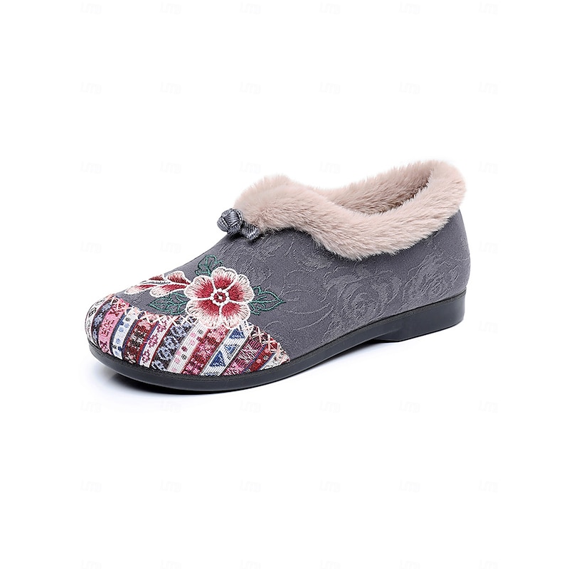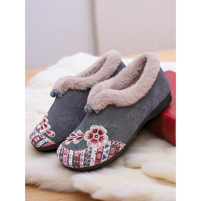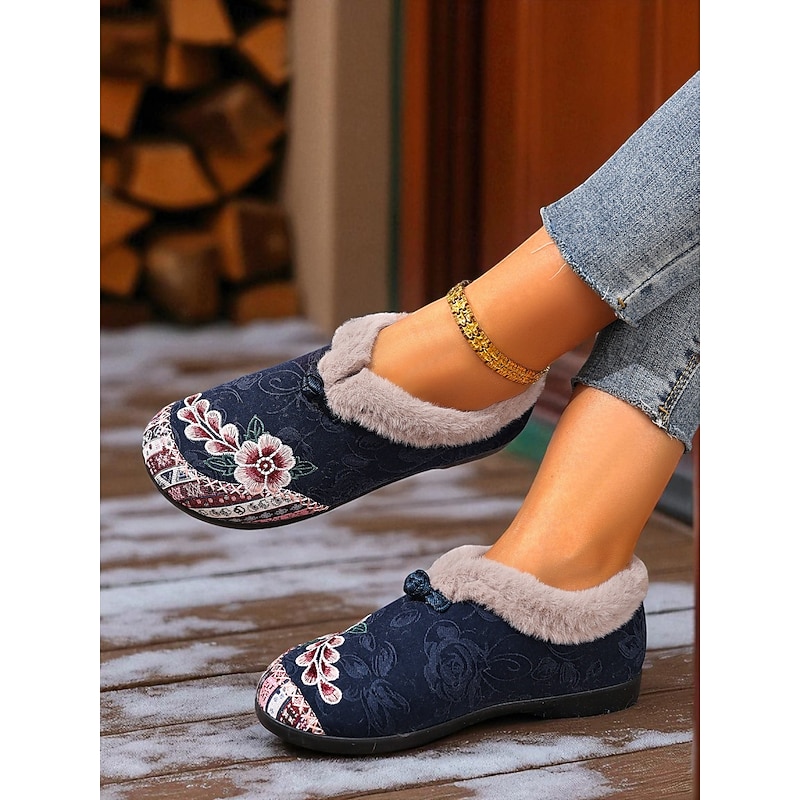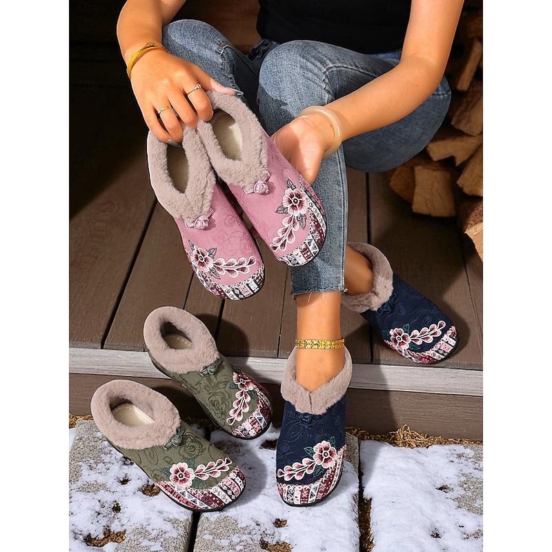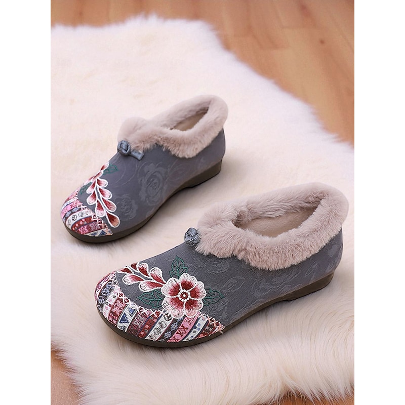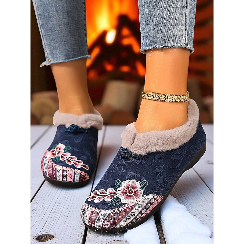 HOT ! Women's Red Embroidered Fur-Lined Slip-on Shoes with Floral Pattern, Warm Winter Shoes for Christmas, Holiday Season and Casual Wear