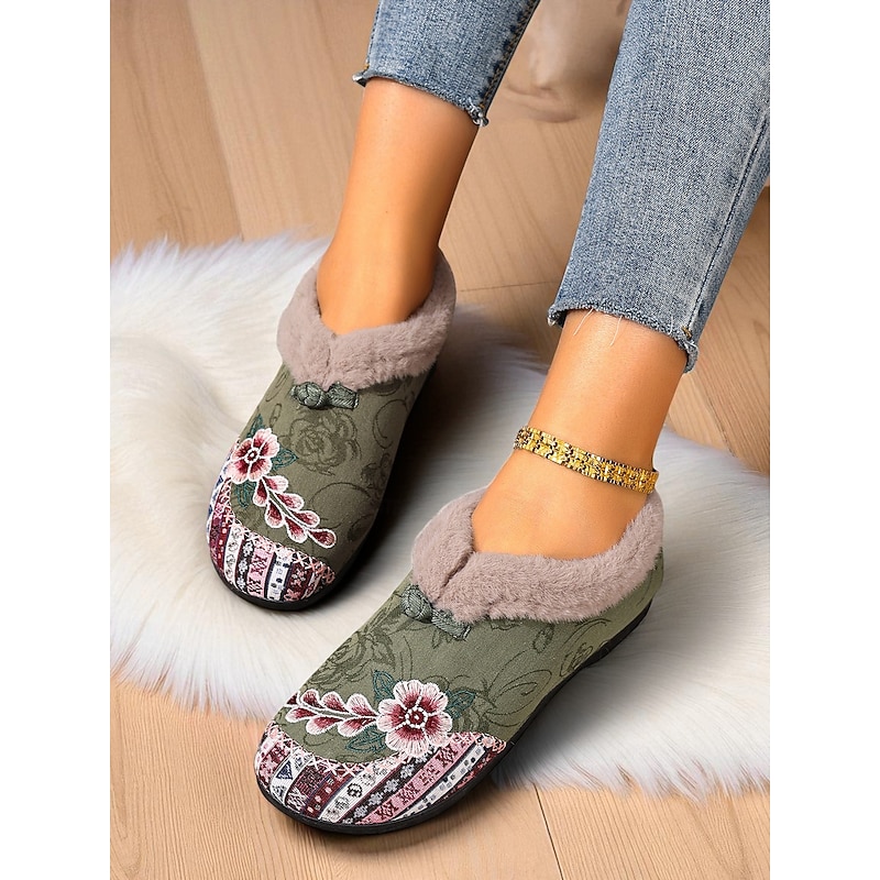 Women's Red Embroidered Fur-Lined Slip-on Shoes with Floral Pattern, Warm Winter Shoes for Christmas, Holiday Season and Casual Wear 1