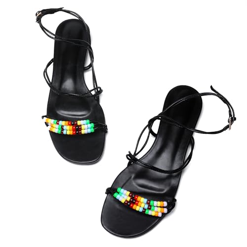 Beaded Flat Sandals for Women Ankle Strap Open Toe Slide Sandals Lace up Casual Summer Dressy Beach Sandals 6