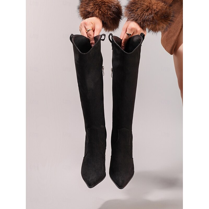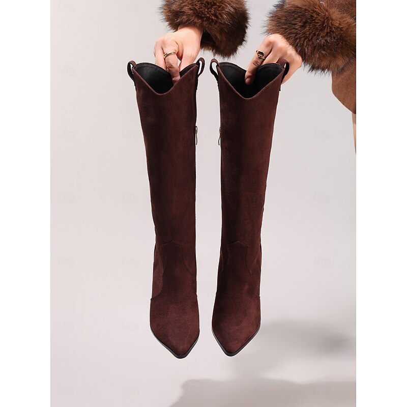HOT ! Women's Brown Suede Knee-High Boots with Block Heel – Pointed Toe Western Style Tall Boots for Fall Outfits, Office Wear and Daily Street Fashion