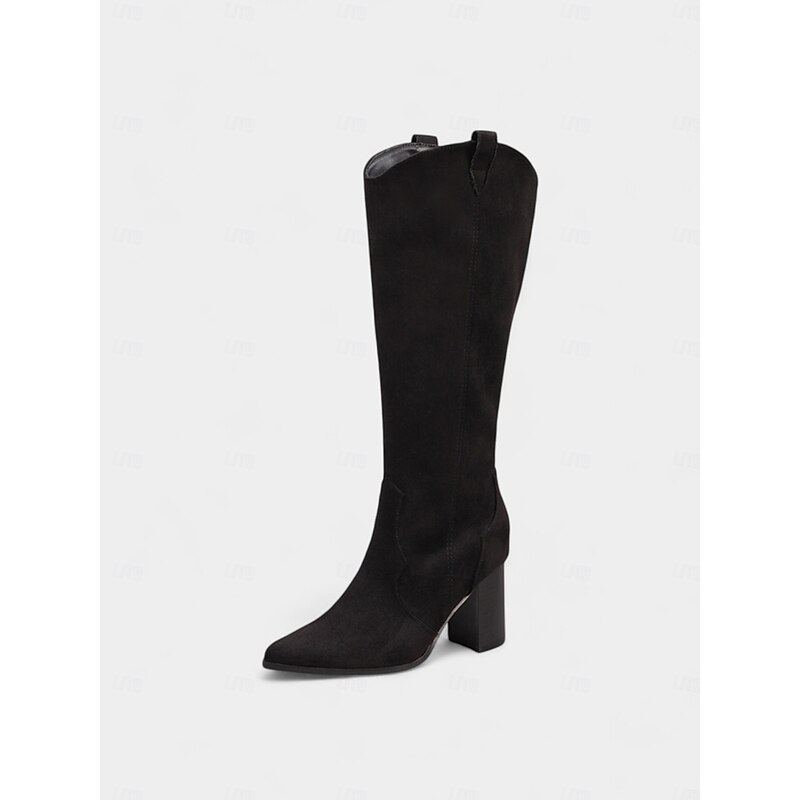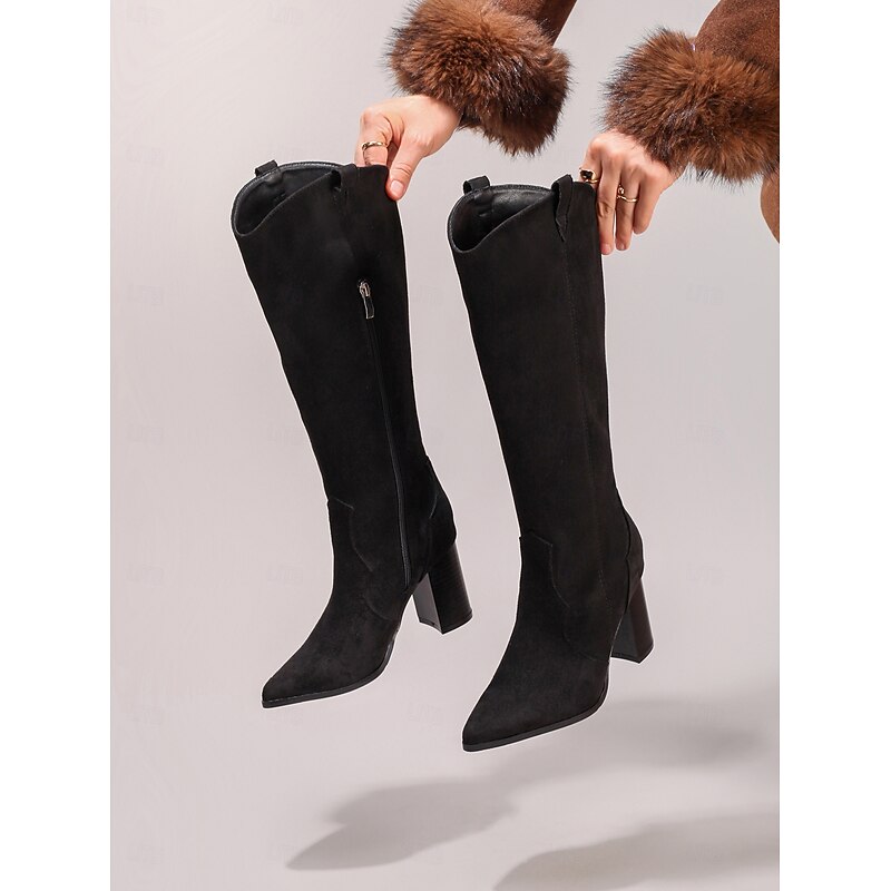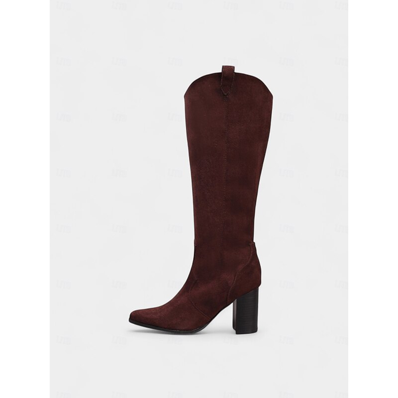 Women's Brown Suede Knee-High Boots with Block Heel – Pointed Toe Western Style Tall Boots for Fall Outfits, Office Wear and Daily Street Fashion 1