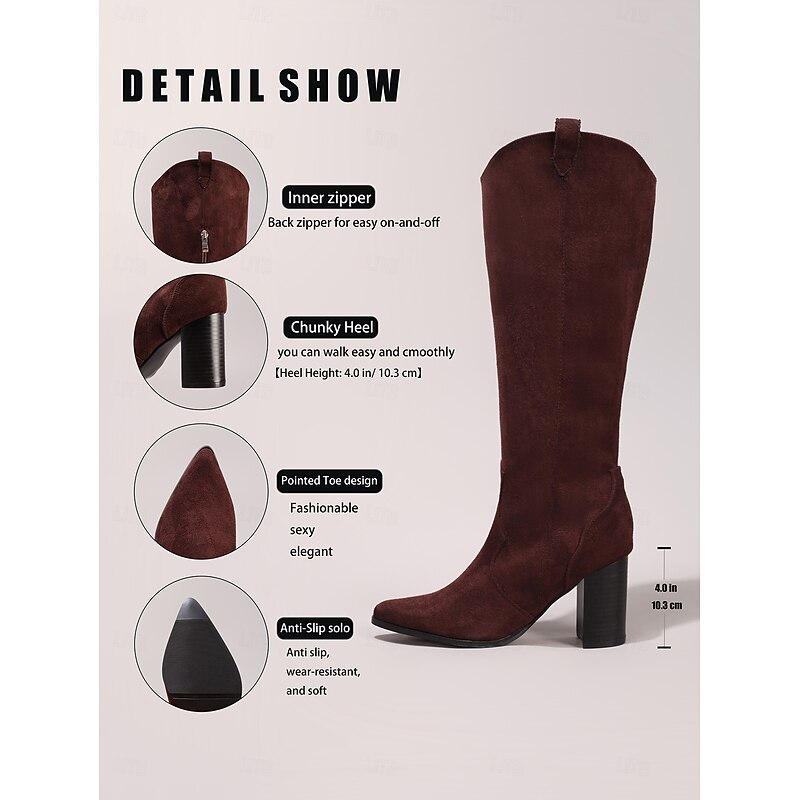 Women's Brown Suede Knee-High Boots with Block Heel – Pointed Toe Western Style Tall Boots for Fall Outfits, Office Wear and Daily Street Fashion 12