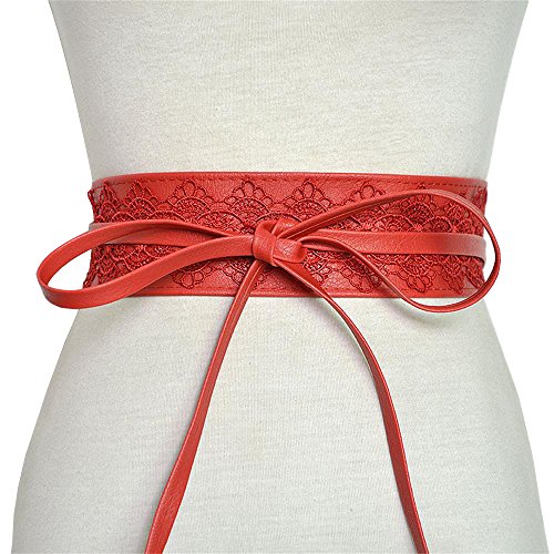 HOT ! Women's Soft Leather with Lace Waist Belt Bow Tie Wrap Around Boho Corset Fashion Elegant for Dresses (Red)