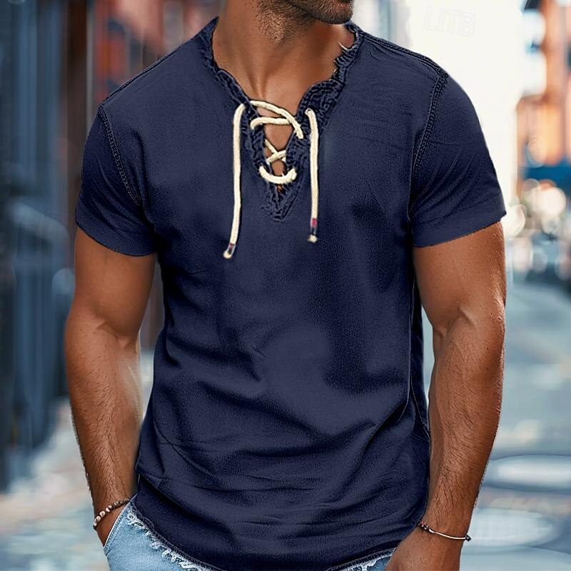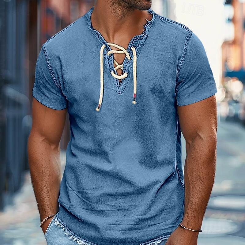 More information about Men's Shirt Summer Shirt Denim Shirt Chambray Shirt Dark Navy Navy Blue Light Blue Short Sleeve Graphic Prints Standing Collar Casual Daily Drawstring Clothing Apparel Fashion Casual Breathable