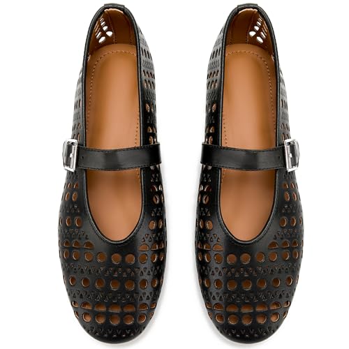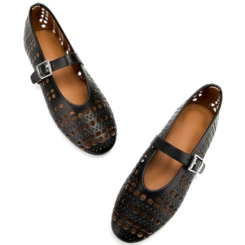 Hollow Ballet Flats Shoes for Women Breathable Hole Round Toe Ballerina Flats Fashion Women's Adjustable Buckle Strap Mary Jane Flats Comfortable Casual Dress 6