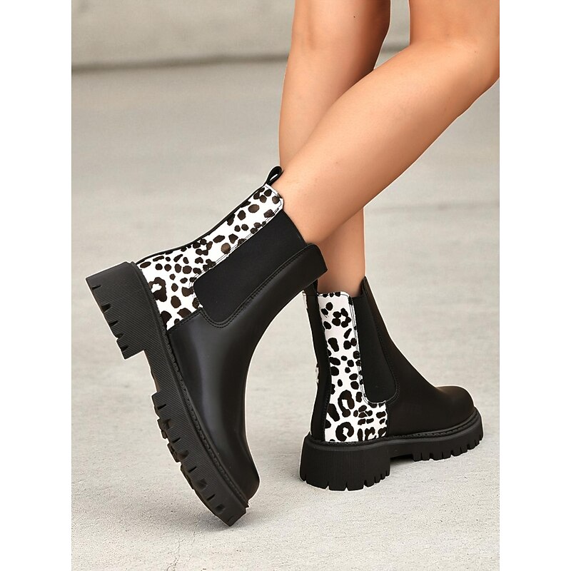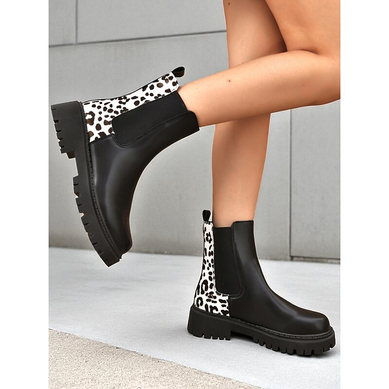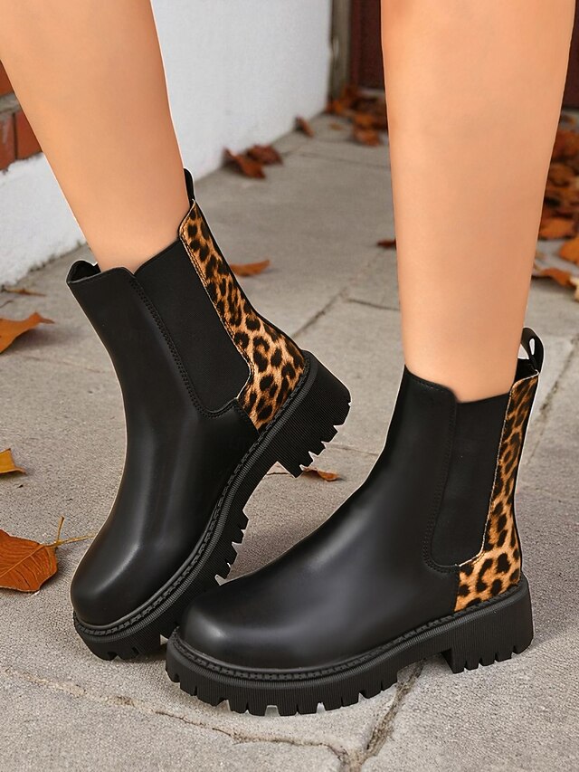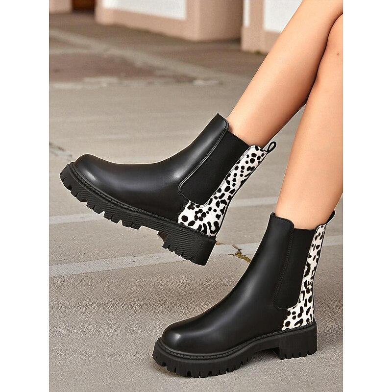 HOT ! Women's Black Chelsea Boots with Leopard Print Detail – Fashion Ankle Boots for Fall Winter Casual Wear