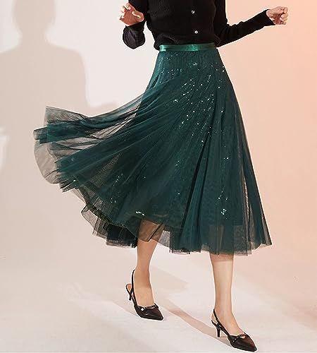 Sequin Long Tulle Skirt Layered Flowy Fairy Sparkle Party Mesh Tea Length Big Hem Skirts for Women