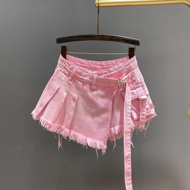 More information about Women's Denim Skirts Patchwork Pleated Asymmetric Burrs Edge Washed Super Short Skirts