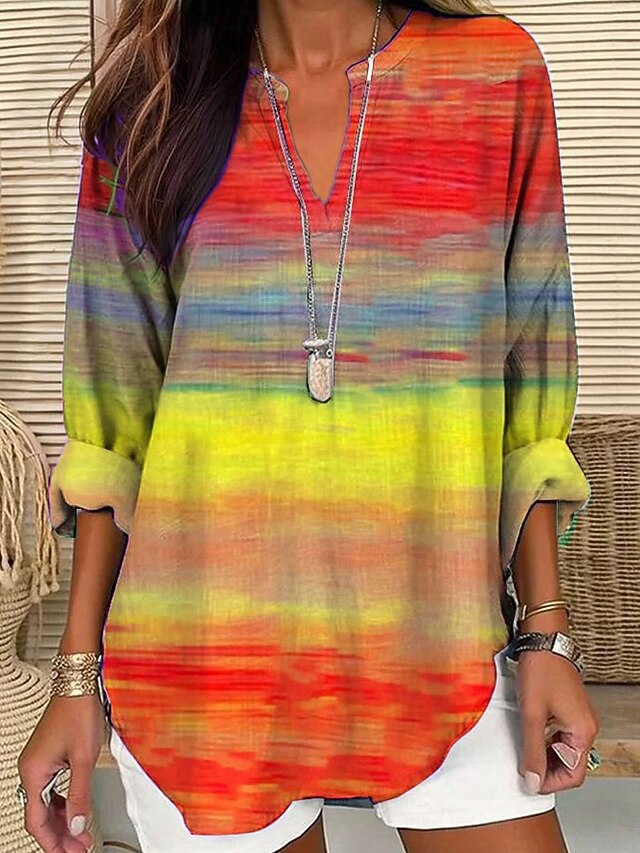 Women's Blouse Tunic V Neck Long Sleeve Boho Casual Tops Ombre Graphic Geometric Vintage Daily Stylish Regular Tops Daily Print Blue Purple Orange Green Fall 2