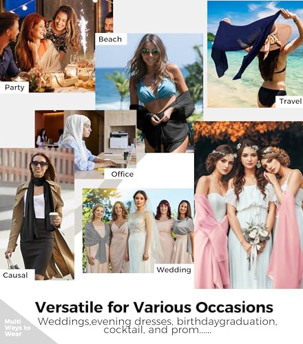Fabric type: ChiffonCare instructions: Hand WashOrigin: Imported【Warm tip】due to each monitor is different, different resolution and settings, you receive the shawl there may be some degree of colour difference, please understand!【Lightweight & Breathable Chiffon】Our chiffon shawls is made of tulle polyester which feels soft and smooth; It's lightweight, comfortable to wear and allows a long span of using.It is soft, skin-friendly, comfortable, quick-drying and lightweight, allowing you to move freely and feel the cool breeze, while still providing coverage and protection, perfect for everyday use.Especially perfect for a chilly outdoor night.【Multi Ways to Wear】 One can wear it long, knotted, looped, twisted, or doubled around neck. Also can be used as sun-protection, head wrap, hijab or cover up. It can be styled in different ways on a Dress, Gown, Blouse, Sweater, Cardigan, Jacket, Blazer, Purse or Shirt. Made with the best materials with you and your unique style in mind. Also can be fold down to a very slim size, perfect to be use as a fashion scarf, headpiece during travel.【One Size Fits Most】Our shawls and wrap is 79x19with excellent coverage and sufficient length, the gorgeous elegant shawl covers your shoulders & arms perfectly and gives your hands freedom. One size fits most women.It is a good size for wear it as a scarf, shawl or wrap for women. This retro & fine workmanship shawl is a great accessory for spring, summer, fall and winter, which will make you look elegant and youthful.【EXPECTED GIFTS】If you're considering what to give that special someone, look no further!This shawl is really a perfect gift for your bridal, family, girlfriend, party guests and bridesmaids. It can be easily matched for your outfit, gown, blouse, jacket, shirt, bridesmaid dress, evening dress, wedding dress, homecoming dress, birthday dress etc. This warm gift will bring good memories and joy to your lover on a special day.【Suitable for Multiple Occasions】This chiffon shawl can be worn on many different occasions, including wedding, party, birthday, Valentine's Day, wedding anniversary and other formal occasions. This sheer chiffon shawl is not only beautiful and elegant, but also practical.Additionally, it makes for a perfect gift choice for birthdays, holidays, anniversaries, or any special occasion, showcasing your thoughtfulness and consideration for the recipient. Perfect for everyday use. top-grade materials and excellent craftsmanship ensure long-lasting durability.