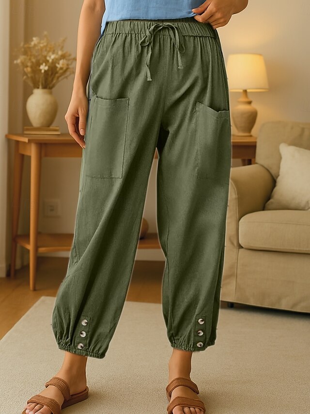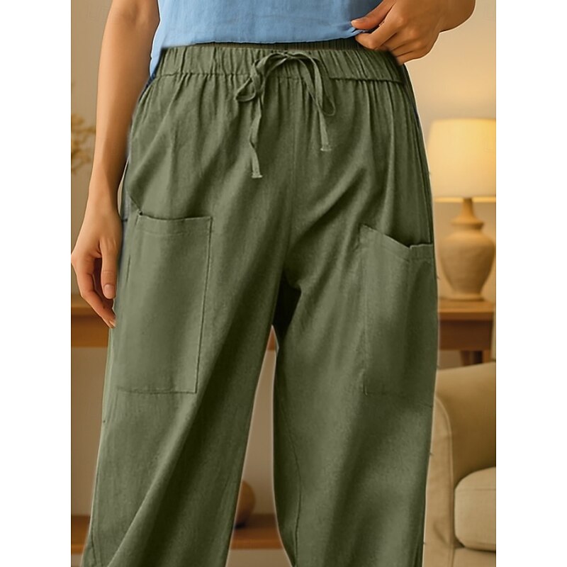 More information about Women's Cotton Linen Pants Comfort Chino Long High Waist Plain Elastic Waist Buckle Comfy Outdoor Comfortable Street Daily Wear Going out Army Green Summer Regular Fit