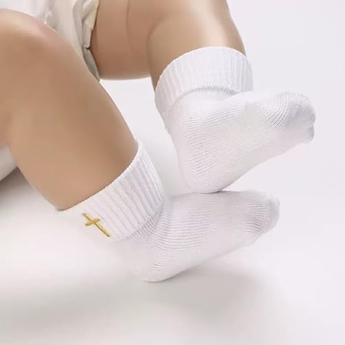 • DESIGN FEATURES: Beautiful white cotton baptismal socks adorned with embroidered cross detailing and delicate eyelet frilly lace trim for a traditional christening look