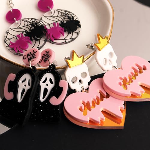 JeanBeau Halloween Skull Pink Heart Skeleton Spooky Ghost Bat Vampire Mouth Drop Dangle Acrylic Earrings Set for Women Cute Gothic Party Holiday Accessories Fashion Costume Jewelry Gift 7