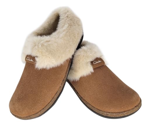 More information about Clarks Womens Slipper Suede Leather Plain Toe - Plush Faux Fur Collar/Lined With A Cork Midsole - Open Back Indoor Outdoor House Slippers For Women (Cognac US 10