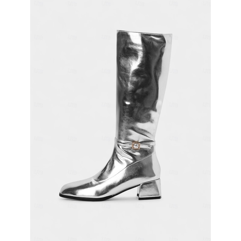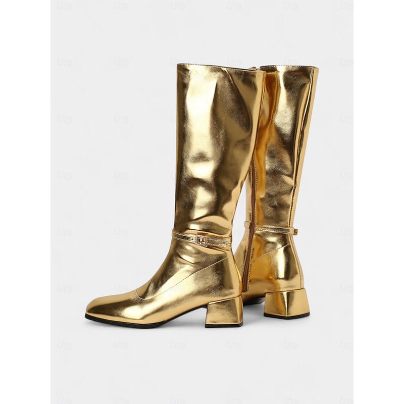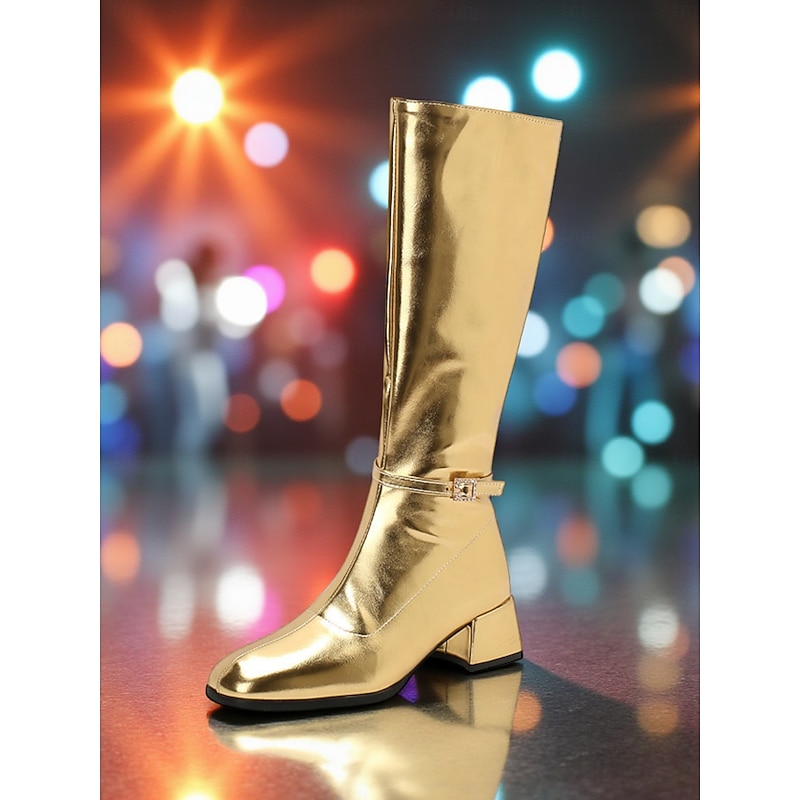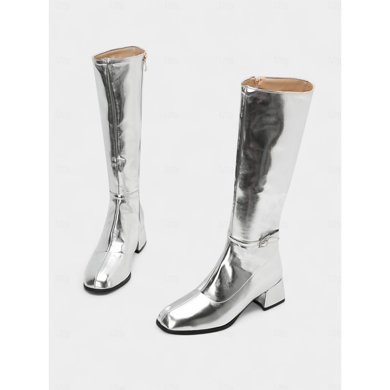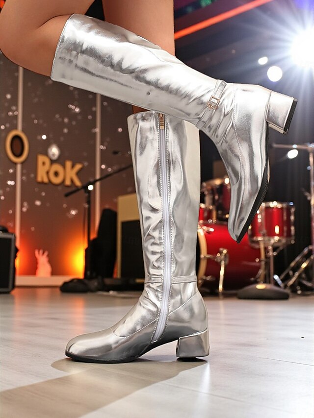 Women's Silver Shiny Knee High Go Go Boots with Side Zipper and Block Heels, Retro 70s Disco Style Party & Dance Boots 1