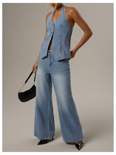 HOT ! SweatyRocks Women's Denim Top Halter Neck Backless Jean Vest Tops Button Up Waistcoat
