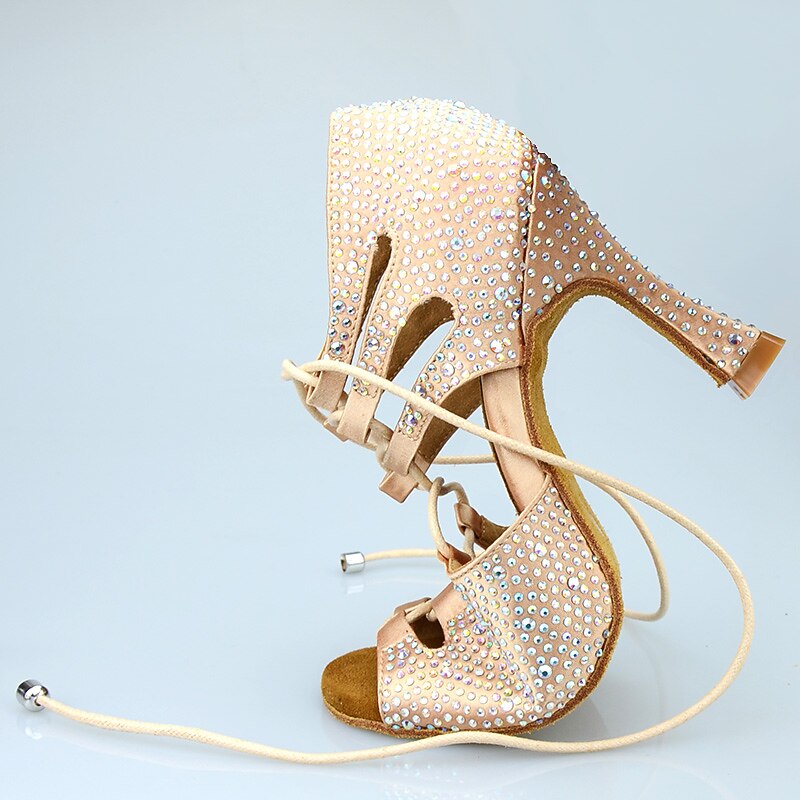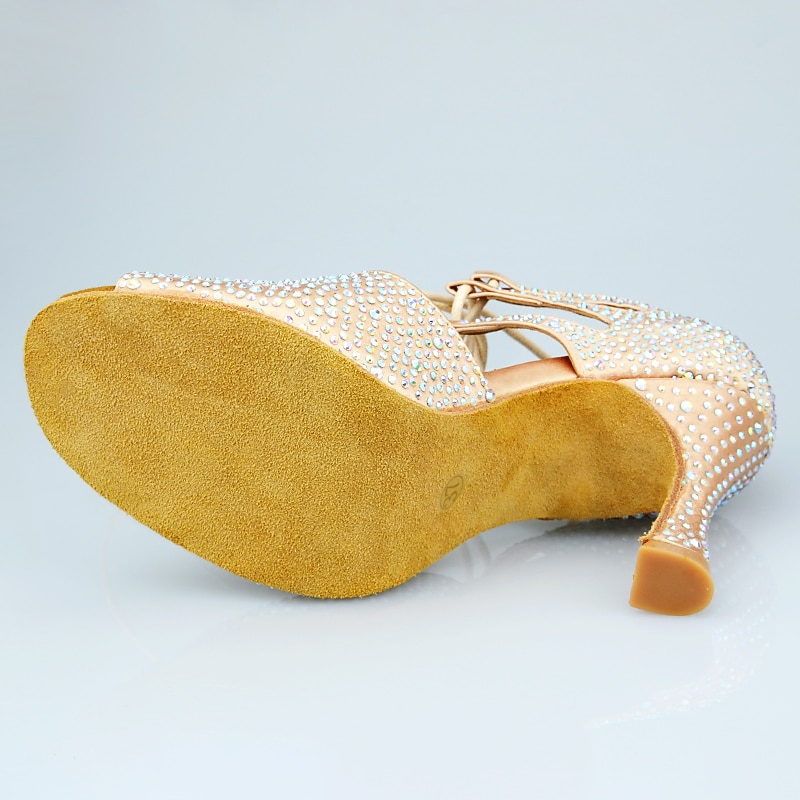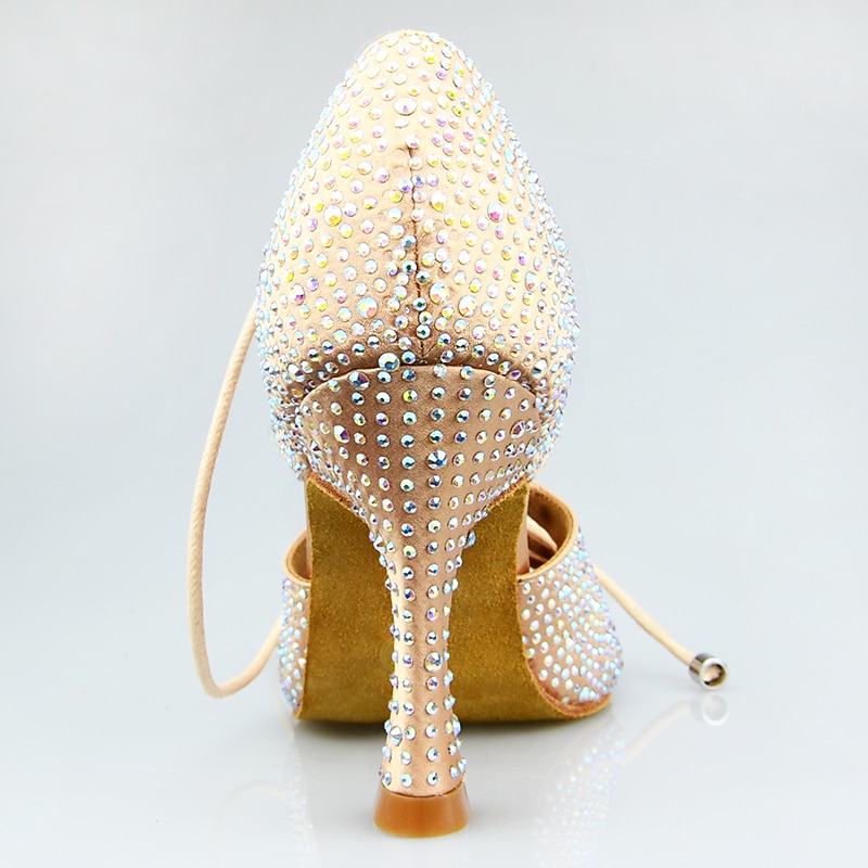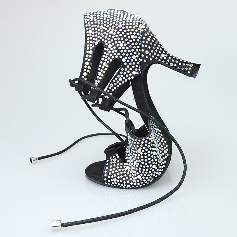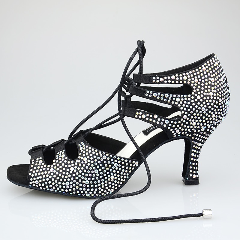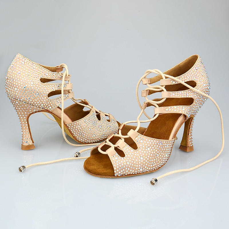 Highlights [Fabric] : Crafted with premium satin, these women's Latin dance shoes are adorned with sparkling glitter and crystal rhinestones, offering a luxurious feel and an eye-catching appearance. The combination of satin and embellishments ensures a glamorous look with every step. [Silhouette] : Featuring a classic open-toe design, these shoes are crafted to enhance both elegance and comfort. The lace-up closure ensures a snug fit, while the flared mid-height heel provides stability and style, perfect for those graceful dance moves. [Design Highlights] : The shoes showcase a sophisticated strappy design that elegantly wraps around the foot, complemented by jeweled embellishments that glimmer under the lights. The flared heel adds a touch of drama while offering the necessary support for dance performances. [Occasions] : Ideal for a variety of settings, these shoes are perfect for performances, training sessions, and parties. Whether taking center stage or dancing at an elegant gathering, these shoes make a striking statement, suitable for dancers looking to combine style and functionality. [Size Range] : Available in a comprehensive size range from US3.5 to US12.5, these dance shoes cater to a wide array of foot sizes, ensuring both the perfect fit and maximum comfort for every dancer.