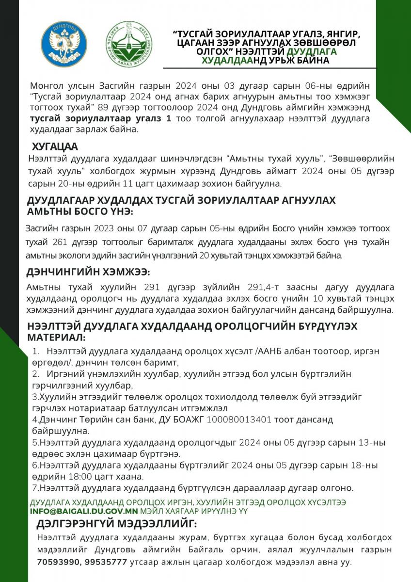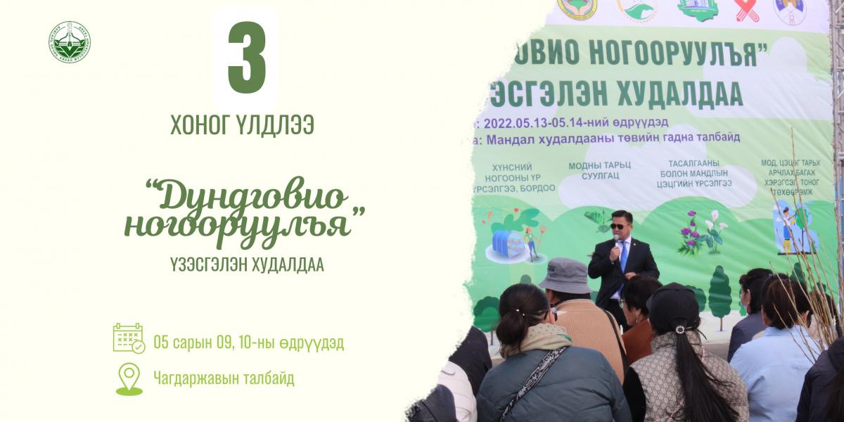 "ДУНДГОВИО НОГООРУУЛЪЯ" ҮЗЭСГЭЛЭН ХУДАЛДАА 05 ДУГААР САРЫН 9, 10-НЫ ӨДРҮҮДЭД“ Тэрбум мод” үндэсний хөдөлгөөн, “Дундговио ногооруулъя” хөтөлбөрийн хүрээнд Бүх нийтээр мод тарих үндэсний өдрийг угтан “Дундговио ногооруулъя” үзэсгэлэн худалдааг 2024 оны 05 дугаар сарын 09, 10-ны өдрүүдэд Чагдаржавын талбайд зохион байгуулах гэж байна. Үзэсгэлэнгээр