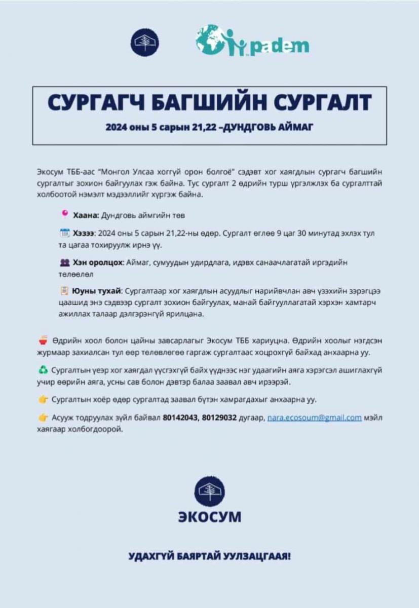 Эко сум ТББ нь Булган аймгийн Хишиг-Өндөр суманд Эко сум төсөл болон бусад олон төслийг амжилттай хэрэгжүүлж байгаа байгууллага бөгөөд манай аймгийн удирдлагууд, БОАЖГ, Баялаг төвийн хүсэлтийн дагуу урилгаар 2024 оны 05 дугаар сарын 21-22-ны өдрүүдэд 09-18 цагт 2 өдрийн “Монгол Улсаа хоггүй орон болгоё” сэдэвт хог хаягдлын сургалтыг зохион байгуулахаар болсон юм. Энэхүү сургалтад өөрийн хүсэлтээр сургалтад сууж цаашид орон нутгийнхаа хог хаягдлын асуудлыг шийдвэрлэхэд оролцох, цаашид сумын иргэдэд хог хаягдлыг бууруулах, ангилан ялгах талаар мэдээлэл сургалт өгөх, “Эко сум” төрийн бус байгууллагатай хамтран ажиллах боломжтой хэн ч бүртгүүлж хүсэлтээ ирүүлэх боломжтой юм. Оролцогчийн тоо хязгаартай тул бүртгүүлсэн иргэдээс оролцуулах боломжтой иргэд рүү эргэн холбогдож мэдээлэх өгөх болно.Дэлгэрэнгүй мэдээлэл авах утас: 86911900, 88018075