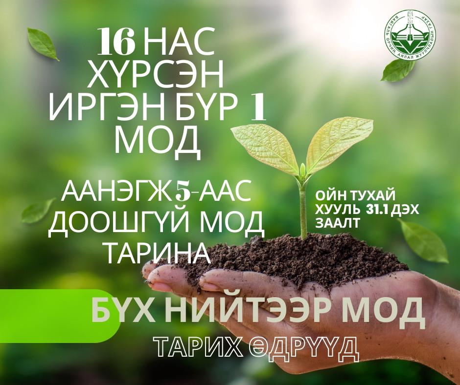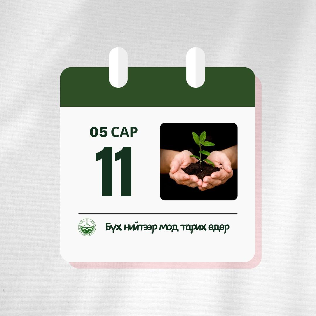 2024 оны хувьд 05 дугаар сарын 11-ний өдөр тохиож байна. Айл өрх бүр хашаандаа мод тарихыг уриалж, энэ өдөр мод тарих боломжгүй тохиолдолд мод усалж, тогоог нь цэвэрлэж, арчлаарай.