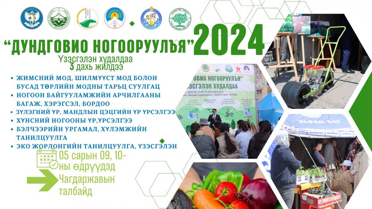 Үзэсгэлэнгийн эхний өдөр хөл хөдөлгөөн дүүрэн өнгөрлөө.Ирж сонирхсон иргэддээ баярлалаа. Монгол Улсын Ерөнхийлөгчийн санаачилсан “Тэрбум мод үндэсний хөдөлгөөн”, “Дундговио ногооруулъя” дэд хөтөлбөрийн хүрээнд, бүх нийтээр мод тарих өдрийг угтан "Дундговио ногооруулъя" үзэсгэлэн худалдааг аймгийн Засаг даргын Тамгын газар, Байгаль орчин, аялал жуулчлалын газар, Хүнс, хөдөө аж ахуйн газар, Сум дундын ойн анги, Мандалын гэгээ хот тохижуулах газар, Сайнцагаан сумын Засаг даргын Тамгын газар хамтран энэ сарын 9, 10-ны өдрүүдэд зохион байгуулж байна. Тус үзэсгэлэнг гурав дахь жилдээ зохион байгуулж байгаа бөгөөд энэ жилийн үзэсгэлэнд 11 иргэн, аж ахуйн нэгж өөрсдийн бүтээгдэхүүнийг сурталчлан оролцсон ба хүнсний ногооны 13 төрлийн үр үрсэлгээ, 4 төрлийн шингэн болон хуурай бордоо, 7 төрлийн жимсний мод, 6 төрлийн навчит, 2 төрлийн шилмүүст модны тарьц суулгац, тасалгааны болон мандлын цэцгийн үр, 35 нэр төрлийн багаж хэрэгсэл, хүлэмжийн тоног төхөөрөмжийг танилцуулан, худалдаалж, мэргэжлийн байгууллагууд шаардлагатай мэдээ мэдээлэл, зөвлөмж үйлчилгээ үзүүлсэн юм. Түүнчлэн үзэсгэлэн худалдаа нь цаг агаарын нөхцөл байдлаас шалтгаалан маргааш буюу энэ сарын 10-ны өдөр Биеийн тамир, спортын газарт үргэлжлэхээр болсон байна.
