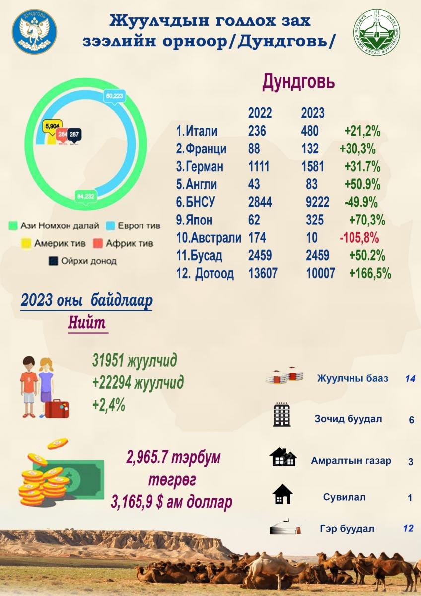 Дундговь аймагт 5 зочид буудал, 7 дэн буудал, 13 ресторан, зоогийн газар үйл ажиллагаа явуулж байгаа бөгөөд 14 жуулчны бааз, 3 амралтын газар, 2 элсэн сувилал, 9 гэр буудал үйл ажиллагаа явуулж байна. 2023 оны байршуулах хэрэгсэл, жуулчны бааз, зочид буудал, гэр буудлаар хоноглосон 31951 гадаад жуулчид байрласан байна.