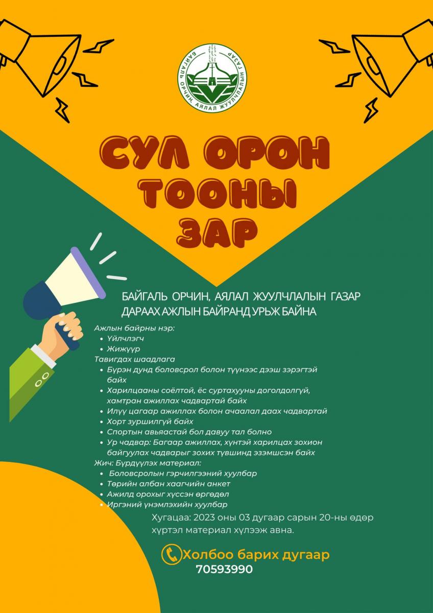 Төрийн захиргааны туслах түшмэлийн албан тушаалын сул орон тооны сонгон шалгаруулалт зарлагдлаа.